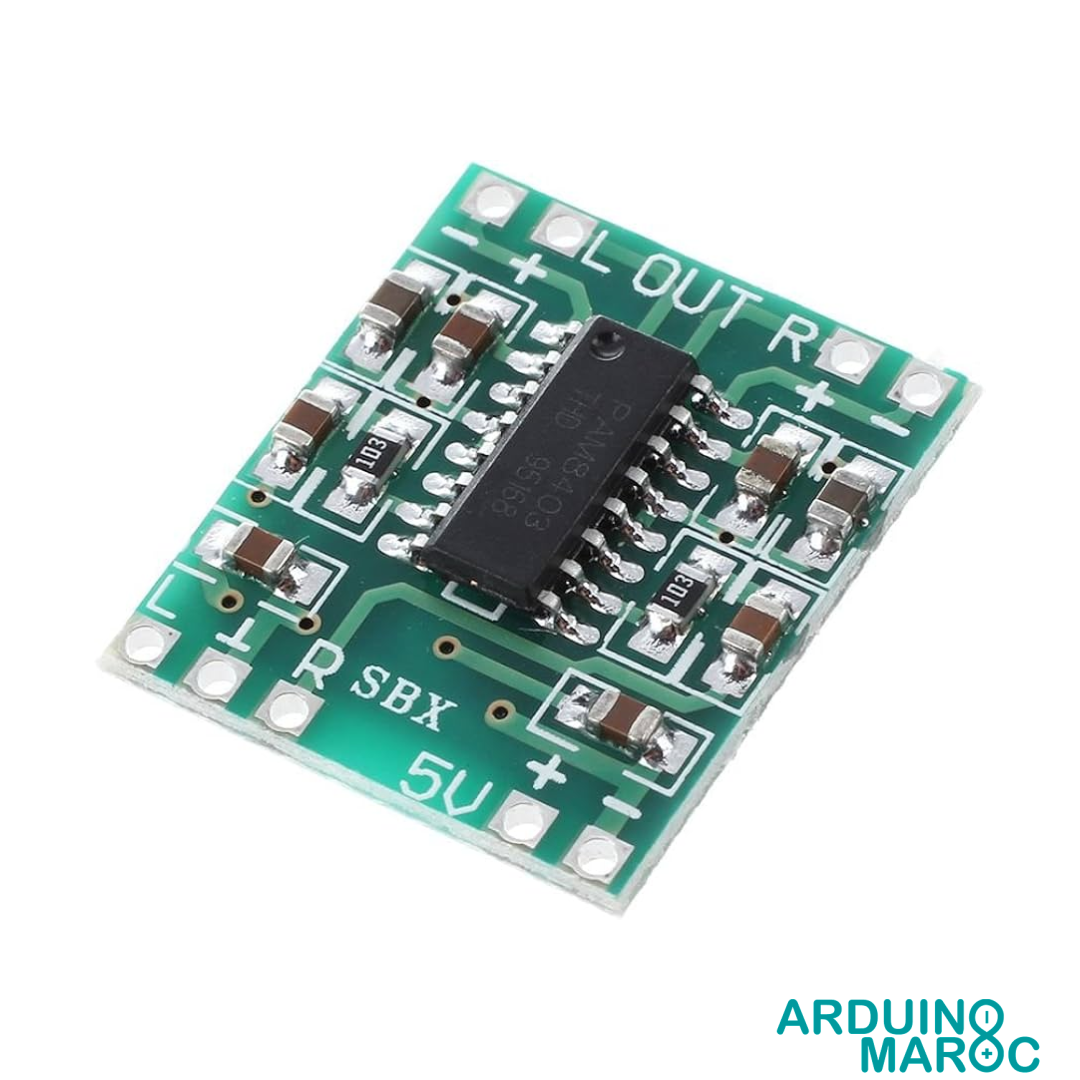 PAM8403 Amplificateur Audio Stéréo 3Wx2 est un module amplificateur classe D compact offrant une sortie efficace de 3W par canal sous 4 ohms. Grâce à un rendement supérieur à 90% et une alimentation entre 2,5V et 5,5V, il s’intègre aisément dans les projets alimentés par batterie, tels que haut-parleurs portables, systèmes audio embarqués ou dispositifs électroniques DIY.